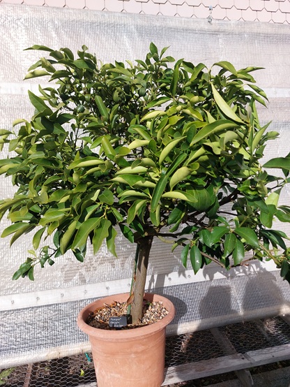 31.10.2019 Einwintern: Das gleiche Elend mit den gefrässigen Raupen hat auch die Obovata erwischt. Die Blüten und somit die Früchte sind fast gänzlich weg. Nächstes Jahr: Massnahmen wie bei der Runden Kumquat.