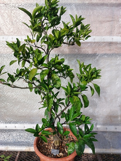 7.10.2019 Einwintern: Die Satsuma sieht gesund aus und hat sich vom Sonnenbrand in heissen Sommertagen sogar gut erholt. Die braun-grün verbrannten Blätter sind wieder grün - erstaunlich. Die Reife stellt sich später als bei der Satsuma Sotschi ein, Anfang Dezember.