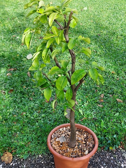 7.10.2019 Einwintern: Wie die Pampelmuse ist sie etwas schwach im Laub. Sie bringt aber einige Früchte, die jedoch auch nicht gross wachsen.